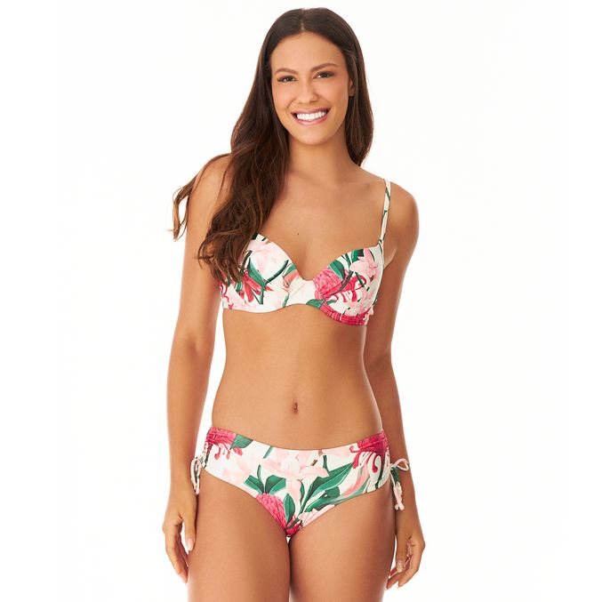 Confeccionado com 84% poliéster 16% elastano, e forro com 90% poliamida 10% elastano. Este conjunto oferece excelente elasticidade e ajuste perfeito ao corpo. O top possui um lindo franzido no busto, bojo modelador e aro, proporcionando o suporte ideal, possui alças finas e fixas que possibilitam duas formas de amarração nas costas, enquanto a calcinha franzida e regulável nas laterais valoriza o corpo e não marca, garantindo conforto em qualquer atividade de verão.