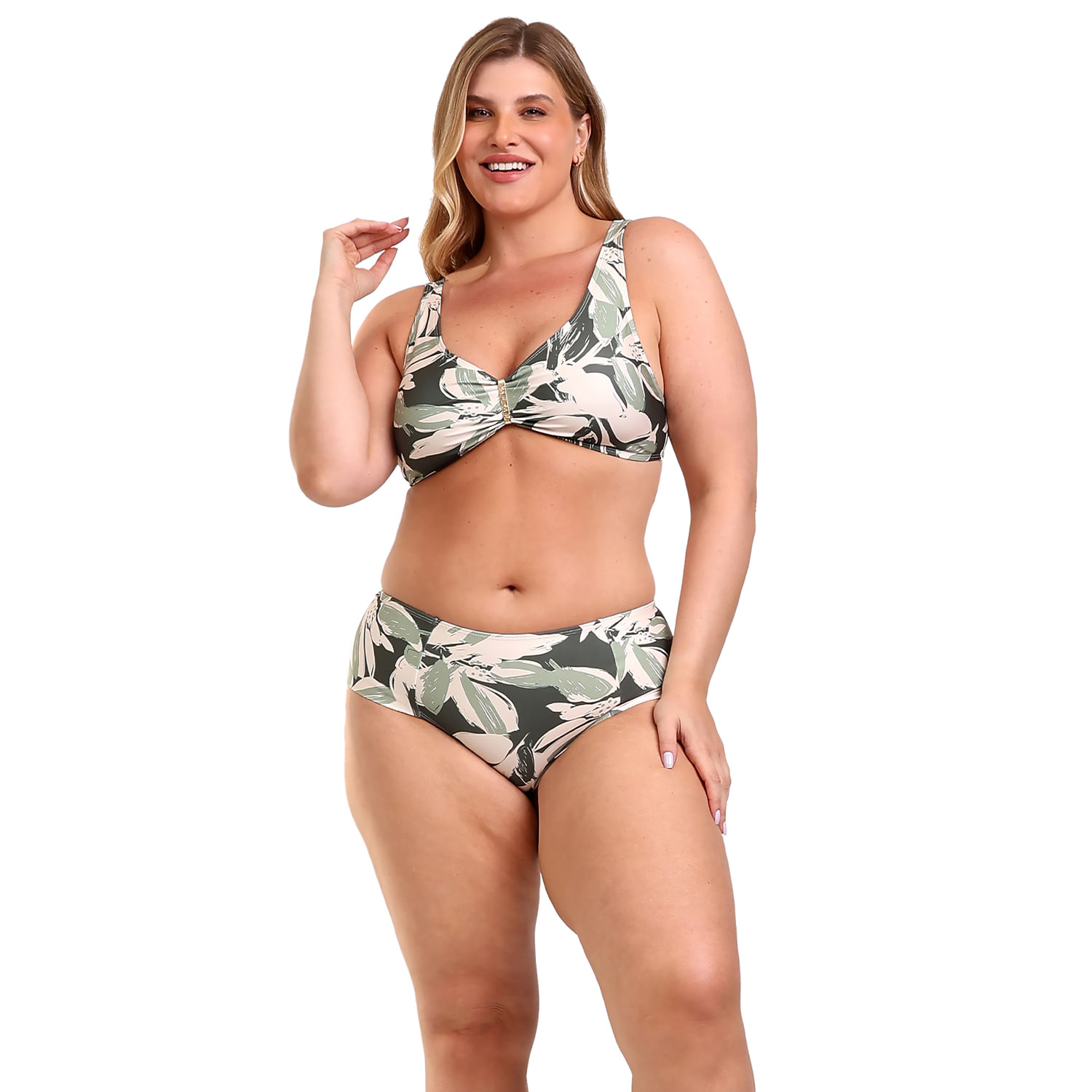 Confeccionado em 84% poliéster e 16% elastano, com forro 90% poliamida e 10% elastano. O top possui alças largas de amarração, bojo removível e detalhe com fivela que valoriza o busto sem o uso de aro. A calcinha tem modelagem lateral dupla, sem elástico nas laterais para não marcar, com parte traseira levemente mais ampla.
